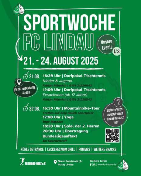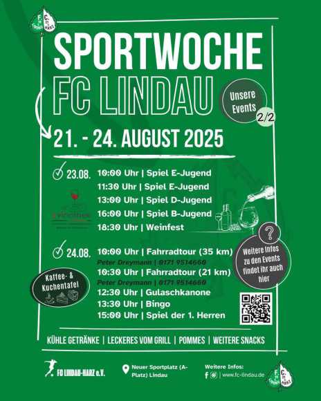 Vom 21.08. – 24.08.2025 gibt's auf dem Sportplatz Lindau wieder jede Menge Programm wenn unsere Sportwoche startet!