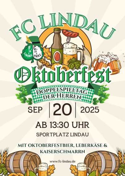 Am 20.09.2025 feiern wir Oktoberfest mit euch im Rahmen des Doppelspieltags der 1. & 2. Herren!